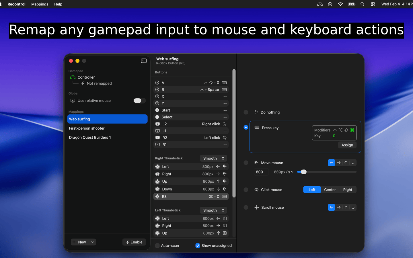 Recontrol is a macOS app that lets you easily map your gaming controller inputs to mouse and keyboard inputs so that you can control games and applications that don’t have gamepad support.